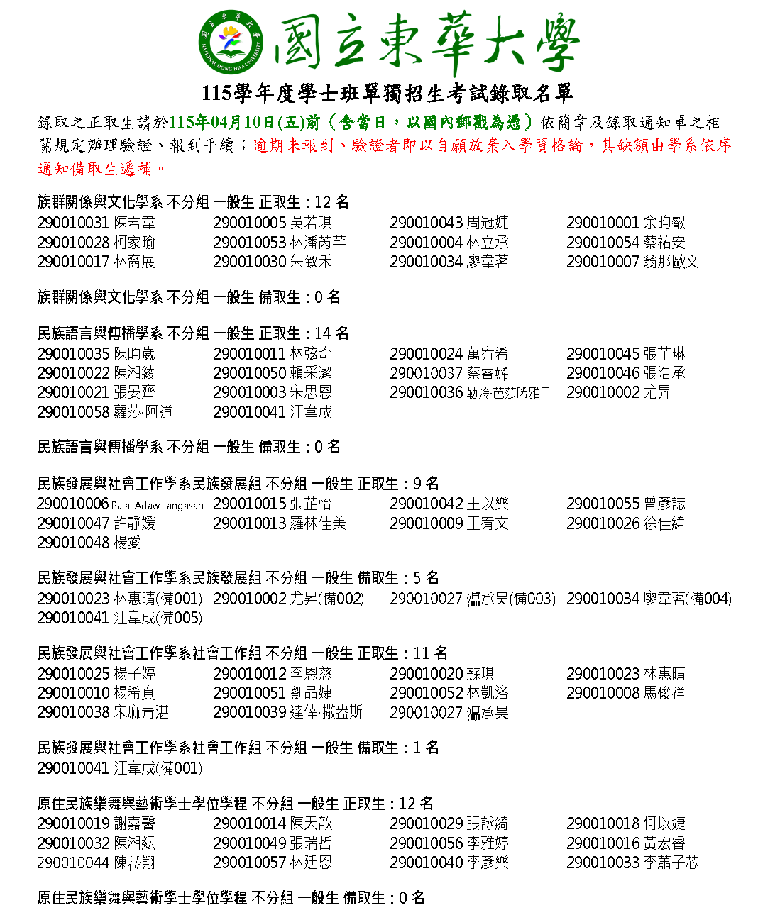 - 第一階段遞補錄取名單,預計於115年04月15日(三)當日起公告於各學系網頁,請備取生自行上網查詢,本校不另以紙本方式通知。